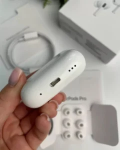 Apple Airpods pro 2 New_Apple AirPods Pro 2rd generation Active Noise Cancellation Earphone Wireless Bluetooth 5.0 Headphone IPX4 Transpare with_popup on_iPhone (no buzzer and volume control) * Active Noise Cancellation reduces unwanted background noise * Adaptive Transparency lets outside sounds in while reducing loud environmental noise * Personalised Spatial Audio with dynamic head tracking places sound all around you2 * Multiple ear tips (XS, S, M, L) * Touch control lets you swipe to adjust volume, press to direct media playback, answer or end calls, and press and hold to switch between listening modes * Sweat and water resistant for Pro 2nd and charging case4 MagSafe Charging Case with speaker and lanyard loop * Up to 6 hours of listening time with Active Noise Cancellation on3 • Up to 30 hours of total listening time with the MagSafe Charging Case and Active Noise Cancellation on3 * Easy setup, in-ear detection and automatic switching between devices6 * Find My with proximity view for Pro 2nd and Precision Finding for charging case8